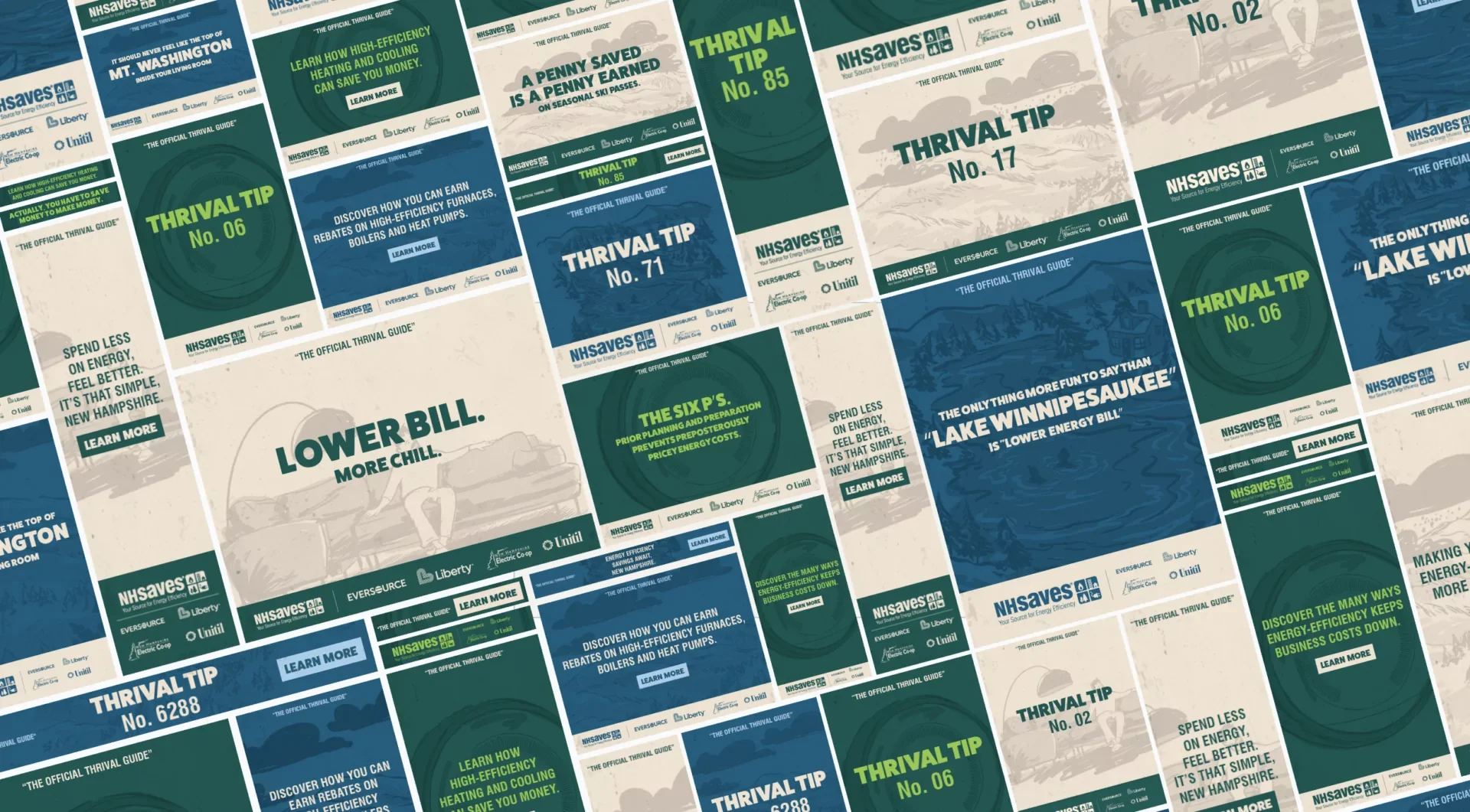 The visually exciting campaign, titled “Thrival Guide,” captured the spirit of New Hampshire with unique graphics that resonated with the local pride of Granite Staters. By taking cues from survival guides and nature booklets, the campaign presented helpful tips about energy-saving rebates and technologies in an engaging format. This multifaceted approach allowed us to maximize the budget for the greatest reach, connecting deeply with both urban and rural residents, and setting the stage for increased energy efficiency participation across the state.